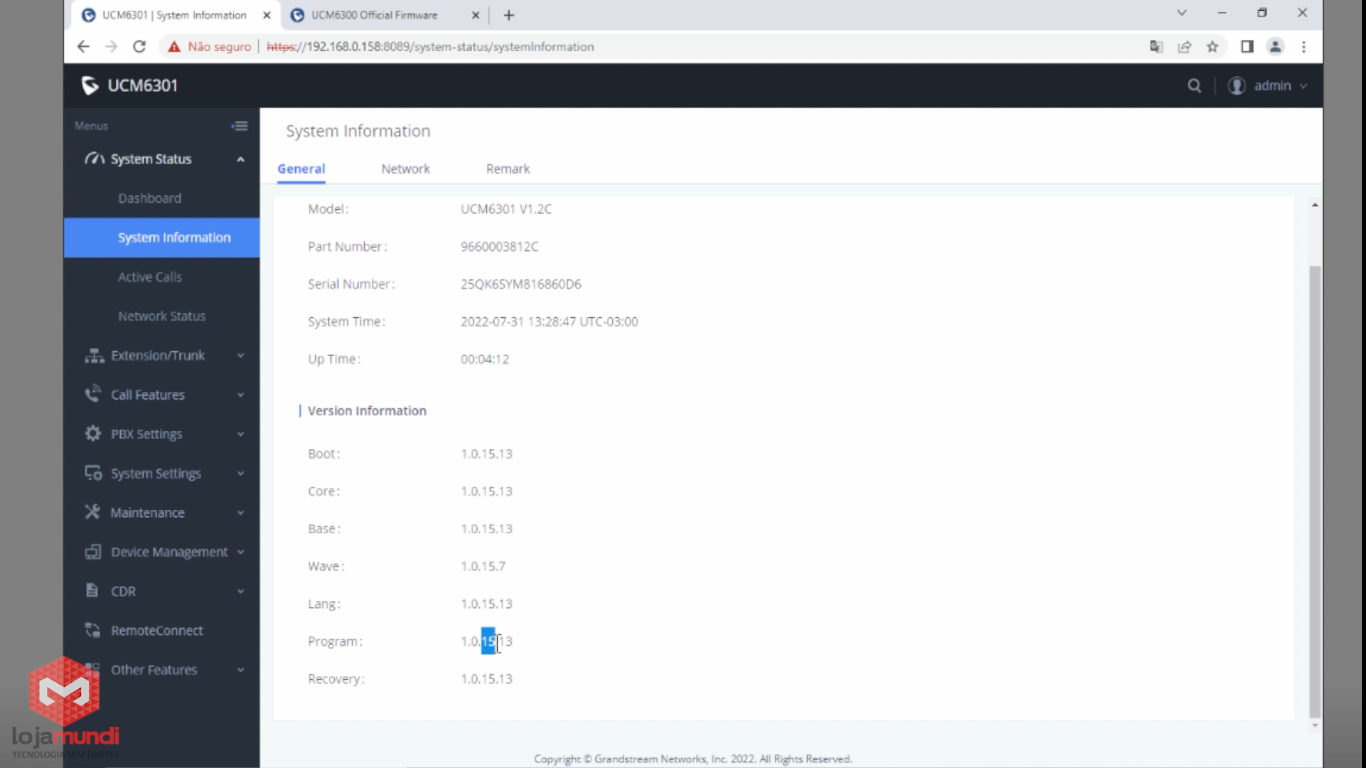 Em System Status > System Information validamos que o equipamento foi atualizado para a versão 1.0.15.13