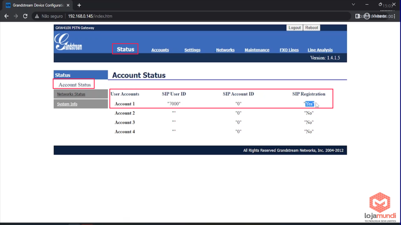 Na guia Status > Account Status > o campo SIP Registration deve estar YES.