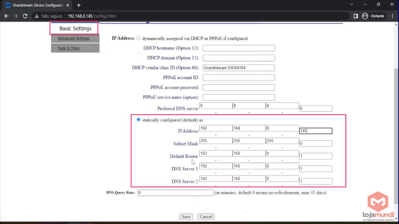 Em Network > Basic Settings > iremos fixar um IP da nossa rede.