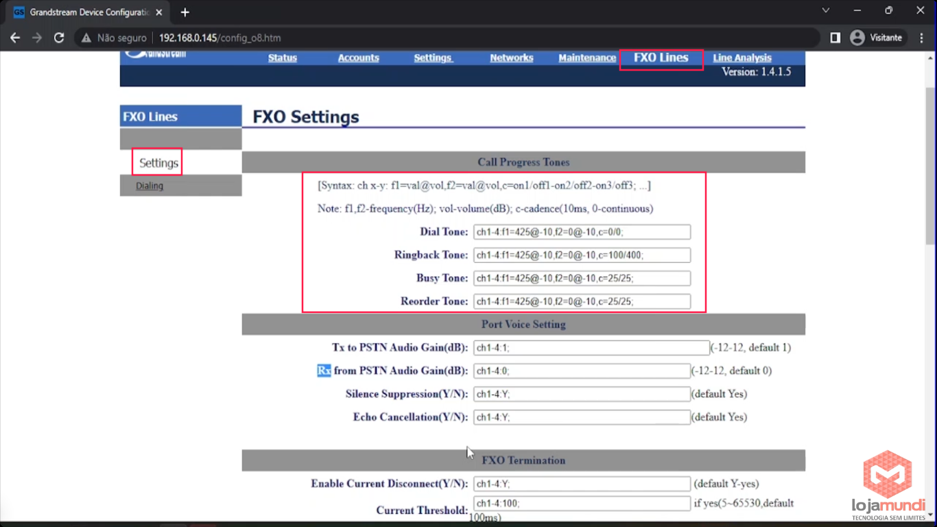 Em FXO Lines > Settings > vamos colocar os tons de discagem brasileiros.