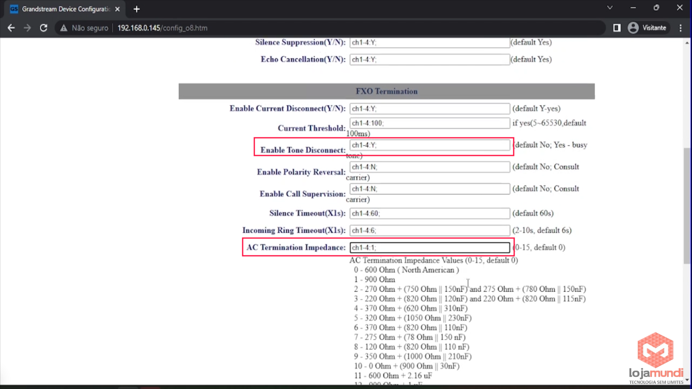 Na mesma aba, vamos colocar como YES o Enable Tone Disconnect e no campo AC Termination Impedance selecione o 1 (900 Ohm).