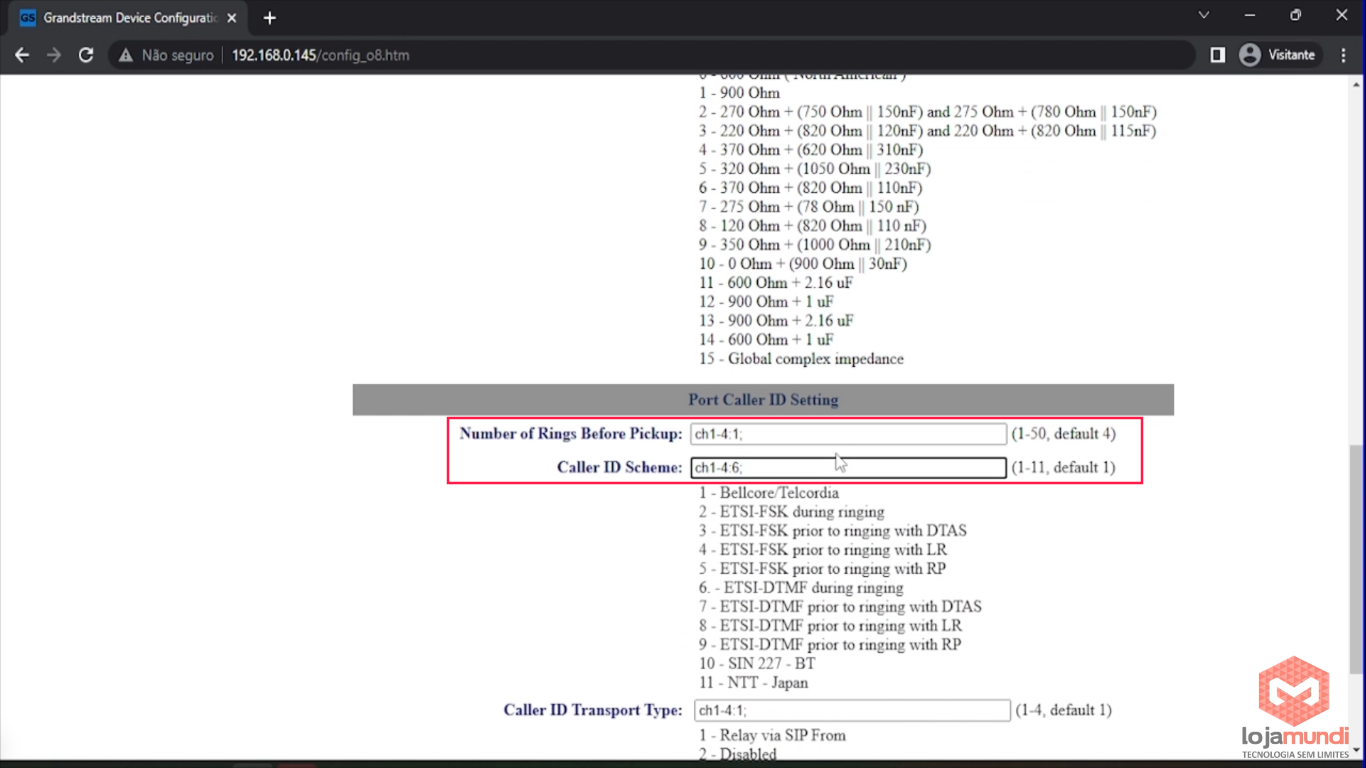 Ainda na mesma aba, o campo Number of Rings Before Pickup vamos selecionar 1 (se o caller id - bina - não funcionar, aumente esse campo para 4) e o parâmetro Caller Id Scheme vamos alterar para 6 (depende da operadora).