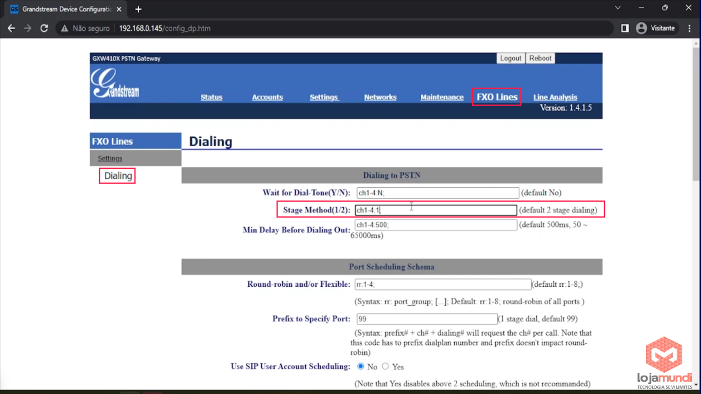 Agora em FXO Lines > Dialing > o campo Stage Method altere para 1 para que o equipamento possa receber e efetuar ligações.