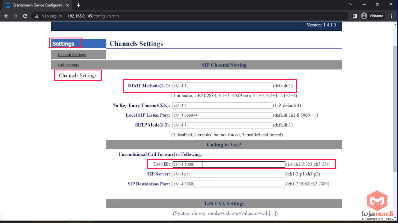 No menu Settings > Channels Settings > vamos alterar os campo DTMF Method para 1 (configure de acordo com seu servidor) e o User ID vamos colocar 1000 (no seu servidor, crie uma regra de entrada com o padrão 1000 para receber essas ligações).