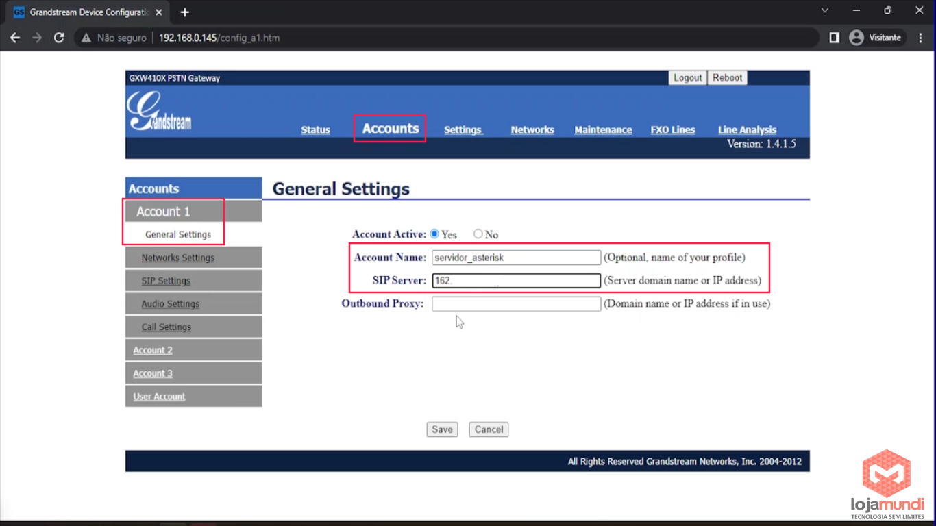 Em Accounts > Account 1 > General Settings > coloque os dados do seu servidor.