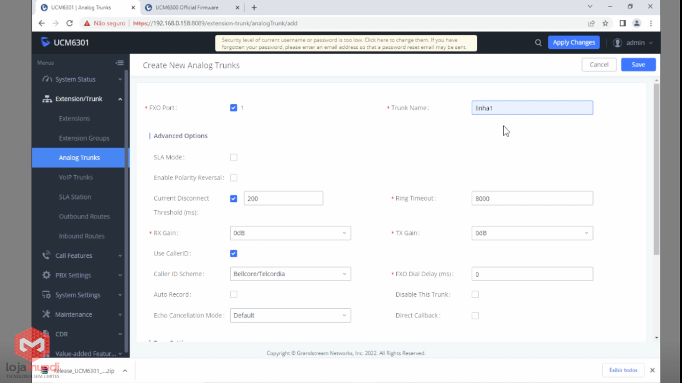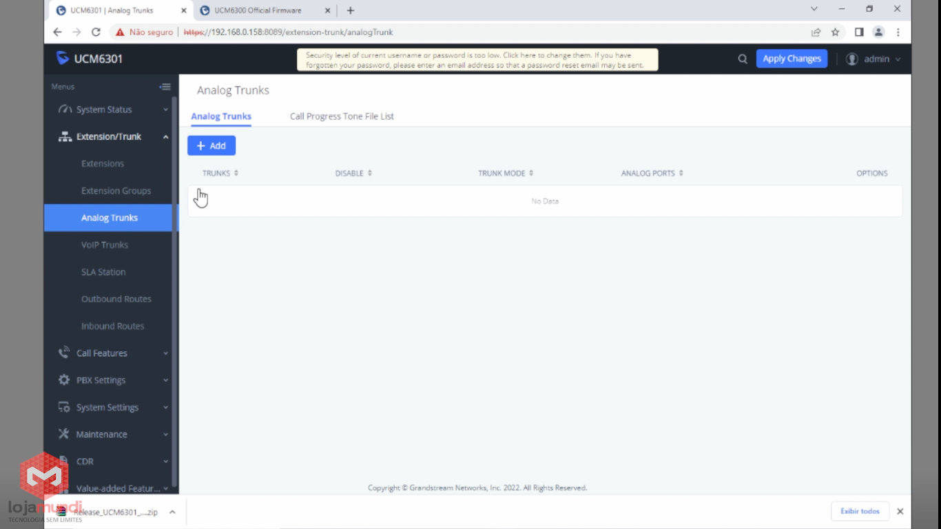 Em Extension/Trunk > Analogs Trunks clique em +Add