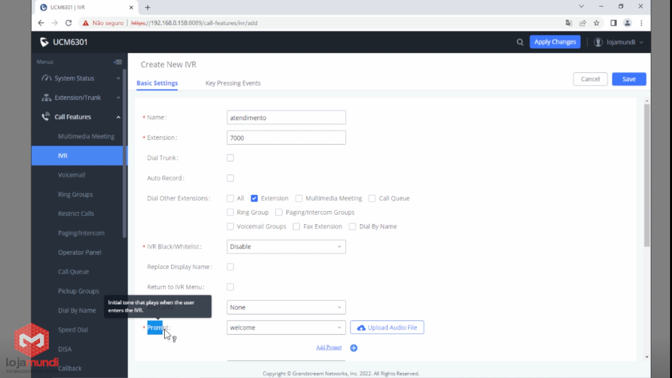 Na guia Basic Settings vamos colocar o nome atendimento e no campo Prompt você clica em “Upload Audio File” para enviar o seu áudio personalizado.