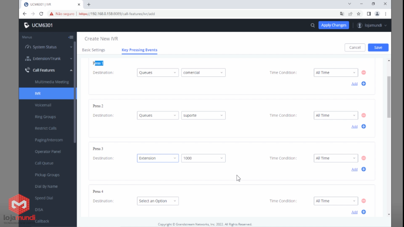 Acessando o Call Features > IVR temos a tela abaixo, vamos clicar em +Add