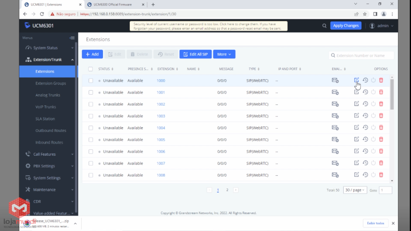 Aula anterior > (Parte 2 de 7 - Criação de ramais em LOTE na UCM63XX)