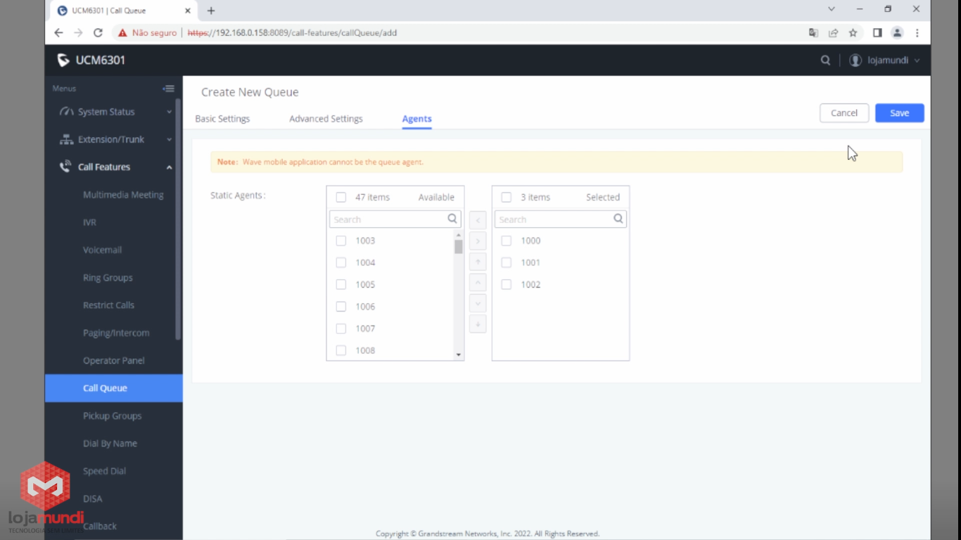 Na guia Agents, mova para a direita os ramais que farão parte da fila. No nosso exemplo, serão 1000, 1001 e 1002.